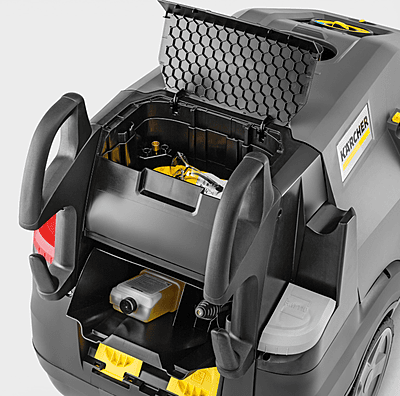 The HDS 10/21-4 M is one of the most powerful hot water high-pressure cleaners in the middle class and also impresses with its sophisticated ergonomics and high level of user-friendliness. Its low-speed, 4-pole and water-cooled electric motor, the robust 3-piston axial pump with ceramic piston and the economical eco!efficiency mode simultaneously ensure maximum performance and reliable, economical operation. The energy-saving EASY!Force Advanced HP trigger gun with servo control and 1050-millimetre-long spray lance with patented nozzle technology as well as the EASY!Lock quick-release fasteners are also included as standard for fatigue-free and time-saving work. Many other equipment and performance details are also impressive, such as the optimised burner engineering, the 2 detergent tanks, the convenient mobility concept, the extensive safety technology, the simple operation with just one switch or the clever accessory storage options.