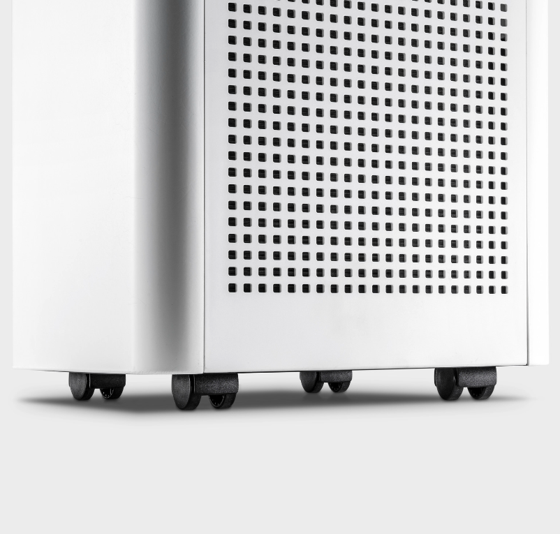 Displays temperature, air humidity and quality, and filter and device status.4 rotating rollers