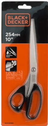 The BDHT81569 is Black and decker universal scissors, 10 inch length, straight handle, stainless steel, black handle for office environments. Long lasting wear-resistant stainless steel blades. Cuts through a variety of materials from paper to cardboard. Item Dimension: 120.0mm x 15.0mm x 320.0mm. Specifications Brand : BLACK+DECKER Model : BDHT81569 Colour : Black Material : Steel Blade Material : Stainless Steel Product Dimensions : 32L x 12W Centimeters