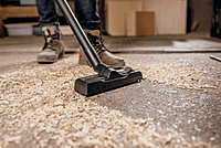 The WD 5 P V-25/5/22 wet and dry vacuum cleaner with a power consumption of 1100 watts achieves perfect cleaning results on all types of dirt – whether dry or wet, fine or coarse.The device comes with a 25-litre plastic container, a 5-metre cord, a 2.2-metre-long suction hose, a switchable floor nozzle, a flat pleated filter and a fleece filter bag. The integrated power outlet with automatic on/off switch allows power tools to be connected. Dirt that is a result of sawing or sanding is suctioned away directly. The rotary switch can be used to adjust the suction power as required. Thanks to the patented filter removal technology, the flat pleated filter can be removed in a matter of seconds while avoiding any contact with dirt. The filter cleaning button can be pressed to efficiently clean the filter and restore the suction power. The removable handle with electrostatic protection allows accessories to be attached directly to the suction hose. The hose can be secured at the device head for space-saving storage. The parking position provided on the bumper allows the tubes and floor nozzle to also be stored quickly and conveniently when taking a short break from work.