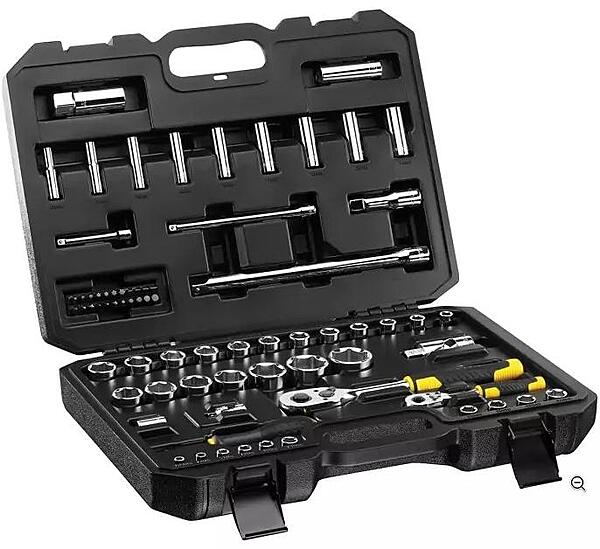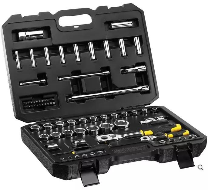 The Stanley STMT45504 is a 20-piece 1/2-inch drive metric socket set featuring a pear-head ratchet with a 72-tooth mechanism, offering a 5� swing arc for tight spaces. Crafted from chrome vanadium steel with a chrome finish, this set includes six-point sockets ranging from 10 mm to 24 mm, designed for durability and corrosion resistance. Product Description Model : Stanley STMT45504 Drive Size : 1/2 inch square drive Ratchet Type : Pear-head with 72-tooth mechanism Socket Points : 6-point configuration Material : Chrome vanadium steel Finish : Chrome-plated for corrosion resistance Socket Sizes : 10 mm, 11 mm, 12 mm, 13 mm, 14 mm, 15 mm, 16 mm, 17 mm, 18 mm, 19 mm, 20 mm, 21 mm, 22 mm, 23 mm, 24 mm Includes : Extension bar, universal joint, and durable storage case Applications : Suitable for automotive and mechanical maintenance tasks