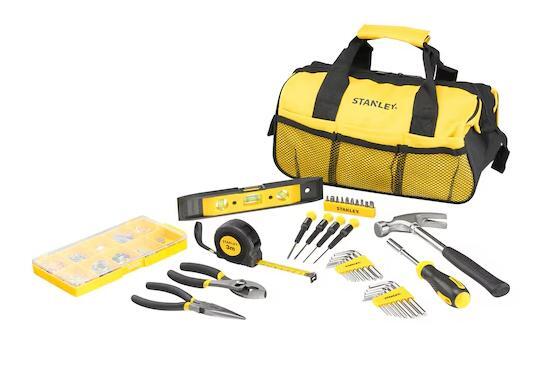 The Stanley STMT0-74101 is a comprehensive 38-piece mixed tool set designed for home repairs, maintenance, and DIY projects. Housed in a durable fabric storage bag, it includes essential tools such as a 3m measuring tape, 369g hammer, combination and long-nose pliers, screwdrivers with 11 bits, 16 Allen keys, and a spirit level.