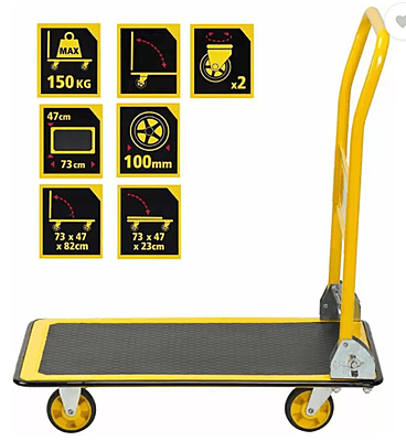 The STANLEY SXWT-PC527P Platform Truck delivers reliable material handling performance across industrial and domestic environments. Built from robust steel, it features a spacious platform with a non-slip rubber mat that improves stability during loading and movement. Weighing around 7 kg, the trolley ensures lightweight maneuverability without compromising strength. It is equipped with four non-puncture Thermoplastic Rubber (TPR) caster wheels, including two swivel and two fixed wheels, for effortless steering and reliable operation on varied surfaces. Specifications Model : SXWT-PC527P Product Type : Steel Folding Platform Trolley / Platform Truck Load Capacity : 150 kg Material : Steel frame with non-slip rubber-mat platform Platform Dimensions : ~48 ? 35 cm base plate Overall Dimensions : Folded: ~73 ? 47 ? 23 cm Unfolded : ~73 ? 47 ? 82 cm Weight : ~7 kg Wheels : 4 ? TPR non-puncture casters (2 swivel, 2 fixed) Handle : Ergonomic, folding space-saving design Typical Use Cases : Ideal for workshops, warehouses, delivery tasks, and home use Country of Origin : India (manufactured by Stanley Black & Decker )