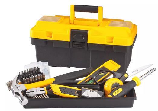 The Stanley STHT81199-LA is a comprehensive 167-piece mixed hand tool set designed for home repairs, maintenance, and DIY projects. Housed in a durable, compact case, this set includes essential tools such as a 12-foot tape measure, 8-ounce hammer, utility knife with 10 blades, torpedo level, diagonal pliers, scissors, magnetic bit tip screwdriver, 32 1" bit tips, 8 SAE and 8 metric hex keys, and picture hanging accessories.