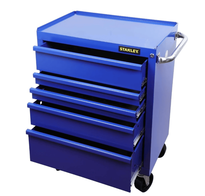 The STANLEY STST74421-8 is a premium, Indian-made Eco Roller Cabinet tailored for tool storage and workstation enhancement. It features a robust metal construction with a resistant powder-coated blue finish, ensuring durability and a clean aesthetic. Security is ensured via lockable drawers, helping keep tools organized and safeguarded from theft or tampering . Drawers are mounted on ball-bearing slides, permitting smooth operation even when fully loaded. Specification Model : STANLEY STST74421-8 Type : 5-Drawer Eco Roller Cabinet Material & Finish : Metal with powder-coated (blue) surface Drawer Count : 5 drawers (multi-size) Dimensions (L ? W ? H) : Approx. 699 ? 460 ? 797 mm Drawer Slides : Smooth ball-bearing slides Mobility : 4 caster wheels (2 swivel with brakes, 2 fixed) Security : Lockable drawers Load Capacity : Approx. 50 kg Origin : Made in India