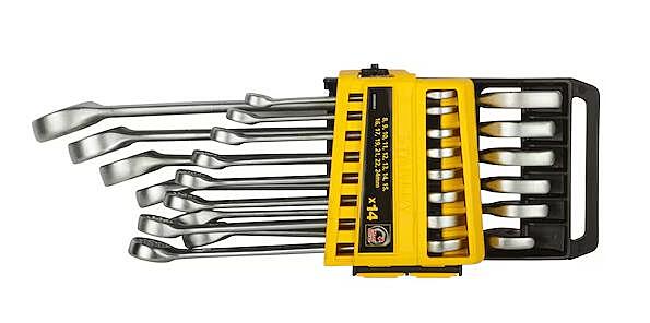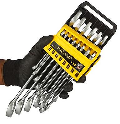 Stanley STMT 78092-8 14PC Carbon Steel Combination Wrench Set Made of Chrome Vanadium Steel Both the open ended head and the ring are angled at 15D for optimum accessibility Nickle chrome plating protects against corrosion Slim pattern Maxi Drive and anti slip open ended jaw shape maintains grip on fastener with only slight rotational pressure Contents: Slimline wrench: 8mm, 9mm, 10mm, 11mm, 12mm, 13mm, 14mm, 15mm, 16mm, 17mm, 19mm, 21mm, 22mm, 24mm