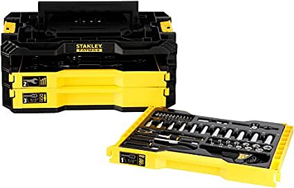 120 BI-MATERIAL RATCHET: Fine 120-teeth mechanism that allows for 3� increments, ensuring tightening capacity and accuracy within narrow spaces. FOLDING HANDLE: Bringing a true handle to carry out the kit everywhere. Allowing a compact store when the handle is close. DURABLE DESIGN: Providing rugged performance for any work environment. PRO-STACK CONNECTIVITY: Fixing with the Large PRO-STACK case, this offers a true mobile solution with STANLEY FATMAX PRO-STACK storage products. DRAWER 2: 14x 1/4? Anti-Slip Combination Wrenches: 6 ?7 ?8 ?9 ?10 ?11 ?12 ?13 ?14 ?15 ?16 ?17 ?18 ?19. DRAWER 3: 1x 1/2? 120T bi-material ratchet, 15x 1/2in. sockets (6-points): 10 ?11 ?12 ?13 ?14 ?15 ?16 ?17 ?18 ?19 ?20 ?21 ?22 ?23 ?24 mm, 3x 1/2? spark plug sockets: 16 ?19 ?21 mm, 2x 1/2in. extensions: 3in. ?10in. 1x 1/2? universal joint, 1x 1/2? 3-WAY Adapter for Sliding T-handle.