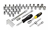 The STANLEY STMT45503 is a comprehensive 26-piece socket set featuring a 1/2" drive and 12-point sockets ranging from 8mm to 32mm. Designed for professionals, this set includes a pear-head ratchet with a 72-tooth mechanism for enhanced torque and accessibility in tight spaces. The sockets are crafted from high-quality chrome vanadium steel with a polished chrome finish, ensuring durability and corrosion resistance.