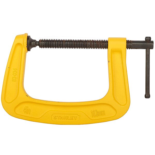 The Stanley 0-83-034 MaxSteel G Clamp is a 100mm (4-inch) heavy-duty clamping tool designed for woodworking, metalworking, and welding applications. It features a corrosion-resistant finish, malleable iron and steel construction, and an oversized T-handle for enhanced torque.